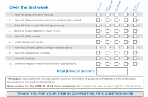 If you are concerned about your mental wellbeing, you could complete the Core 10 screening measure below. If you score 10 or above or have any thoughts of suicide or harm to yourself or another, then please contact your GP for further support and advice. If you feel that you are experiencing a mental health crisis, please contact First Response 0800 952 1181.